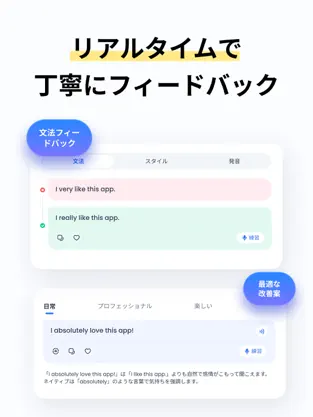ネイティブレベルの発音や自然なフレーズをAIが生成。発話に対して即時フィードバックを得られるので、正しい発音や文法を身につけやすくなります。 -