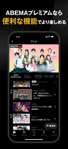 ニュース、アニメ、スポーツ、音楽、バラエティ、ドラマなど幅広いジャンルの番組を 24時間無料で視聴可能。さらに有料プラン「ABEMAプレミアム」では、広告なしで快適に楽しめるほか、オリジナル作品や見逃し配信も利用できます。