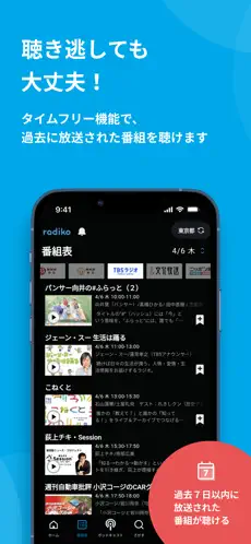 過去1週間以内に放送された番組を、好きな時間に聴き直すことができます。聞き逃し防止に便利です。 -