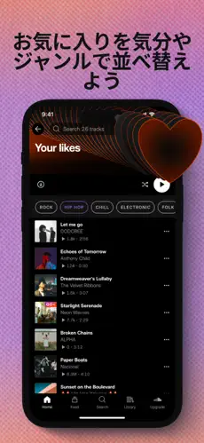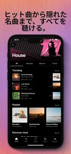 トレンドやおすすめ機能で、自分の好みに合った新しい音楽に出会える。 -