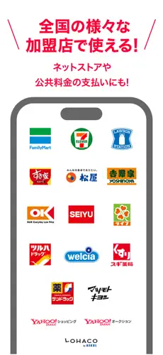 コンビニ(セブンイレブン、ローソン、ファミリーマート)、ドラッグストア、飲食店など幅広い店舗に対応。