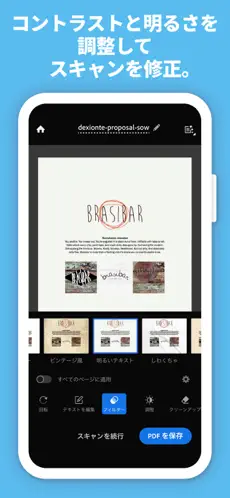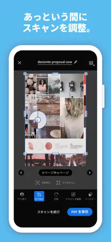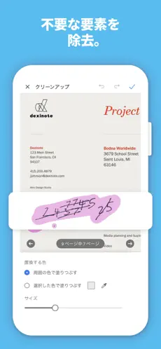 自動的にドキュメントの枠を検出し、歪みや影を補正。まるでスキャナーで読み取ったような美しいPDFを作成できます。