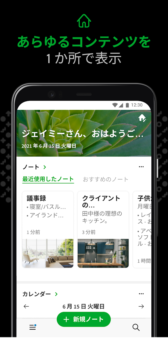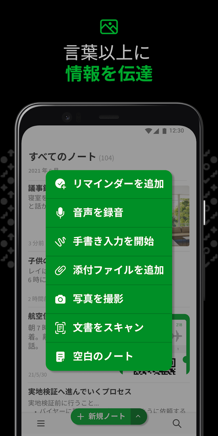 ノート作成と同期:テキスト、チェックリスト、画像、ファイルを簡単に記録し、スマホ・PC・タブレット間で自動同期。