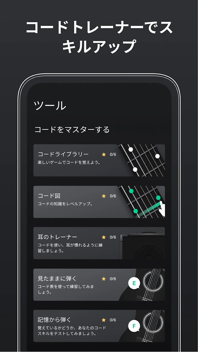 コードライブラリや練習ゲームを搭載。初心者がコードを覚えるのに最適で、上級者の演奏スキル強化にも役立ちます。 -