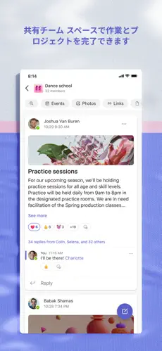 個人チャットからグループチャットまでリアルタイムでやり取り可能。メンションや絵文字でスムーズにコミュニケーション。 -