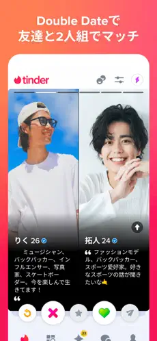 Tinderでは、相手のプロフィールを見て「いいね(右スワイプ)」または「スキップ(左スワイプ)」を選択。お互いに「いいね」するとマッチングが成立し、チャットを始められます。