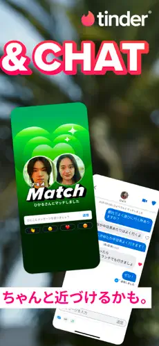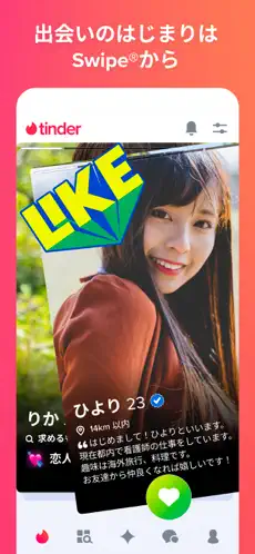 Tinderでは、相手のプロフィールを見て「いいね(右スワイプ)」または「スキップ(左スワイプ)」を選択。お互いに「いいね」するとマッチングが成立し、チャットを始められます。