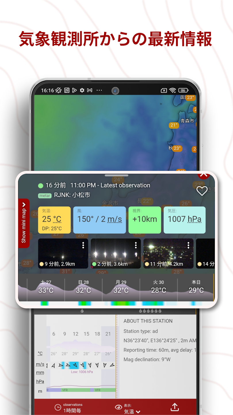 一般的な天気予報だけでなく、風向き・風速、雨雲レーダー、気温、気圧、台風の進路予測 などをリアルタイムで確認できるのが特徴です。